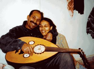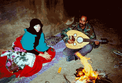 Now we will practice more of our songs in the hotel room... We have been singing Iraqi and Egyptian songs for the brothers' uncle, J., who has been showing up with his new young wife... she is a second wife... the first one lives in Bagdad... J. is serious and jolly at the same time... was a military man until he got shot in the war against Iran... now retired, he comes over to discuss stories and philosophies about women with his two nephews... Kristina and I throw in our two cents from time to time... J. is enjoying a renewed youthful vigor from this second marriage... but Ali says it probably won't last because J. is very responsible toward his first wife and the 10 children they have... we ask questions: to get married the man must give money to the woman... to get divorced the man must also give money to the woman... to be married to more than one woman the man must be able to afford this... if he gives something to one wife he should give the same to the others... but the women cannot initiate divorce proceedings the way men can unless the husband is physically abusive... this is "because women are more passionate and might make decisions impulsively..." but to guard against impulsive decision-making by the men it is customary to give the couple 3 chances to get back together if the man has announced that divorce is necessary... but only three... if he announces divorce three times then it is prohibited for them to try to get along any more... ...unless it is arranged for the woman to marry another man for a brief period of time, wait three months and then return for a fourth try... ...well it's all somewhat familiar and yet different... the marriages are arranged... if you like some girl you ask your parents to approach her parents... in J.'s case it is said that his father put a gun to his head and said, "you will marry this one..." when J. was only 17... here he is smiling and giggling away with his new second wife... obviously enjoying himself immensely...